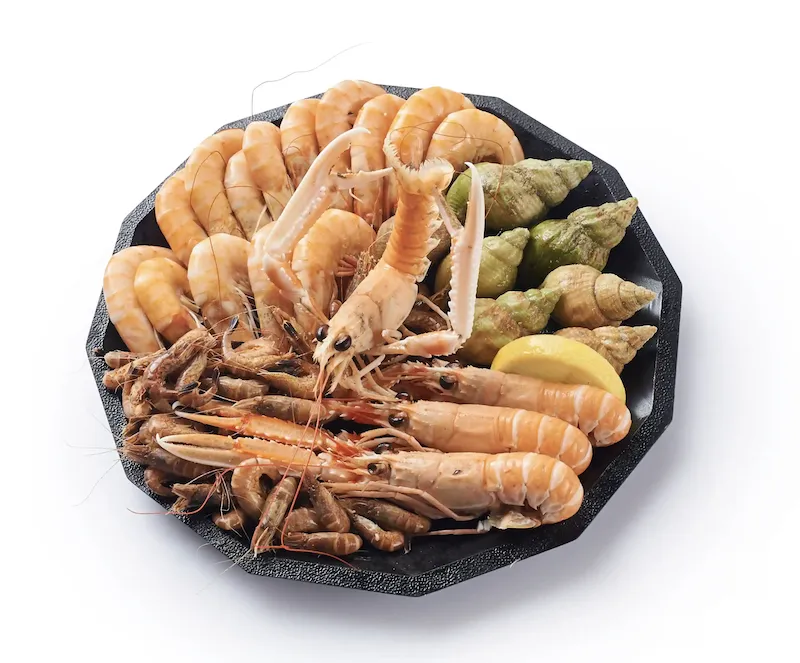 Langoustines, crevettes, bulots, crevettes grises. Contient des sulfites